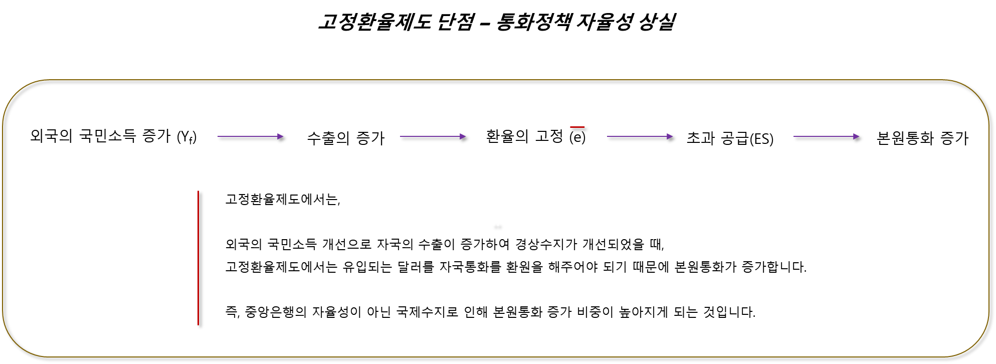 고정환율제에서는 외국의 경제 상황이 국내에 쉽게 영향을 미칩니다. 외국에서 경제가 좋아지면 수출이 증가하고, 그로 인해 국내 통화량이 증가하게 됩니다. 이렇게 되면 물가 상승과 같은 다양한 문제가 발생할 수 있어요.