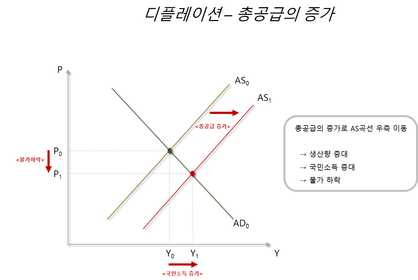 총공급이 증가하면 AS(총공급) 곡선이 우측으로 이동하면서 물가가 하락합니다. 이 때도 물론 물가는 하락하지만, 총공급 증가로 인한 디플레이션과 총수요 감소로 인한 디플레이션은 그 영향이 다릅니다.
