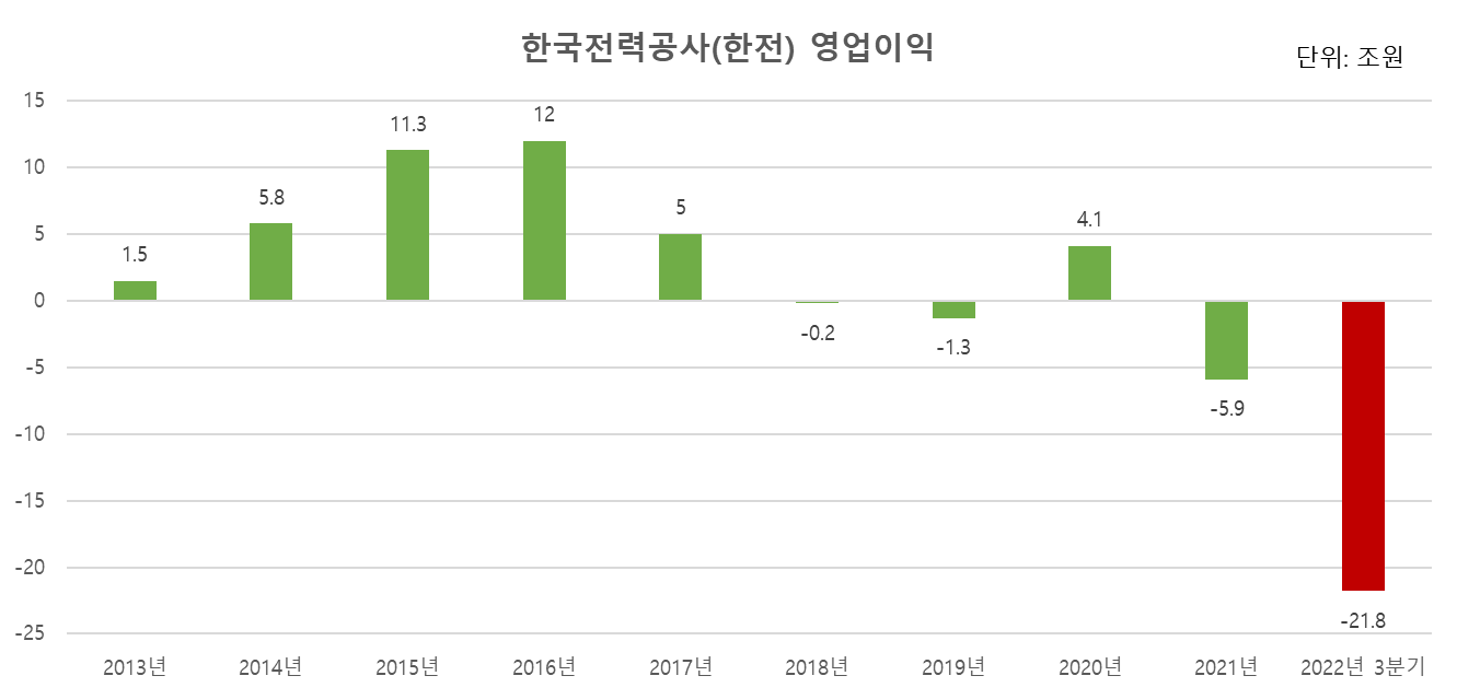 먼저 한국전력공사의 영업이익을 보자면 2021년 약 5.9조원 적자 그리고 2022년 3분기까지 약 21.8조 원 적자이고 23년는 약 30조 원의 적자를 전망하고 있습니다. 2022년도에 유독 적자폭이 급등한 것을 확인하실 수 있습니다.