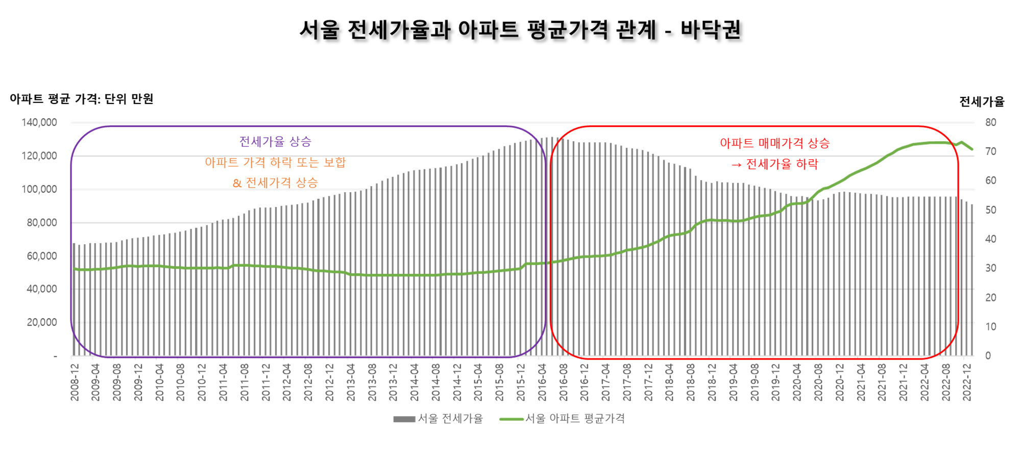 위의 그래프는 2008년 12월부터 2022년 12월까지 서울 아파트 평균 가격과 전세가 비율 두가지를 그래프로 표현한 것입니다.