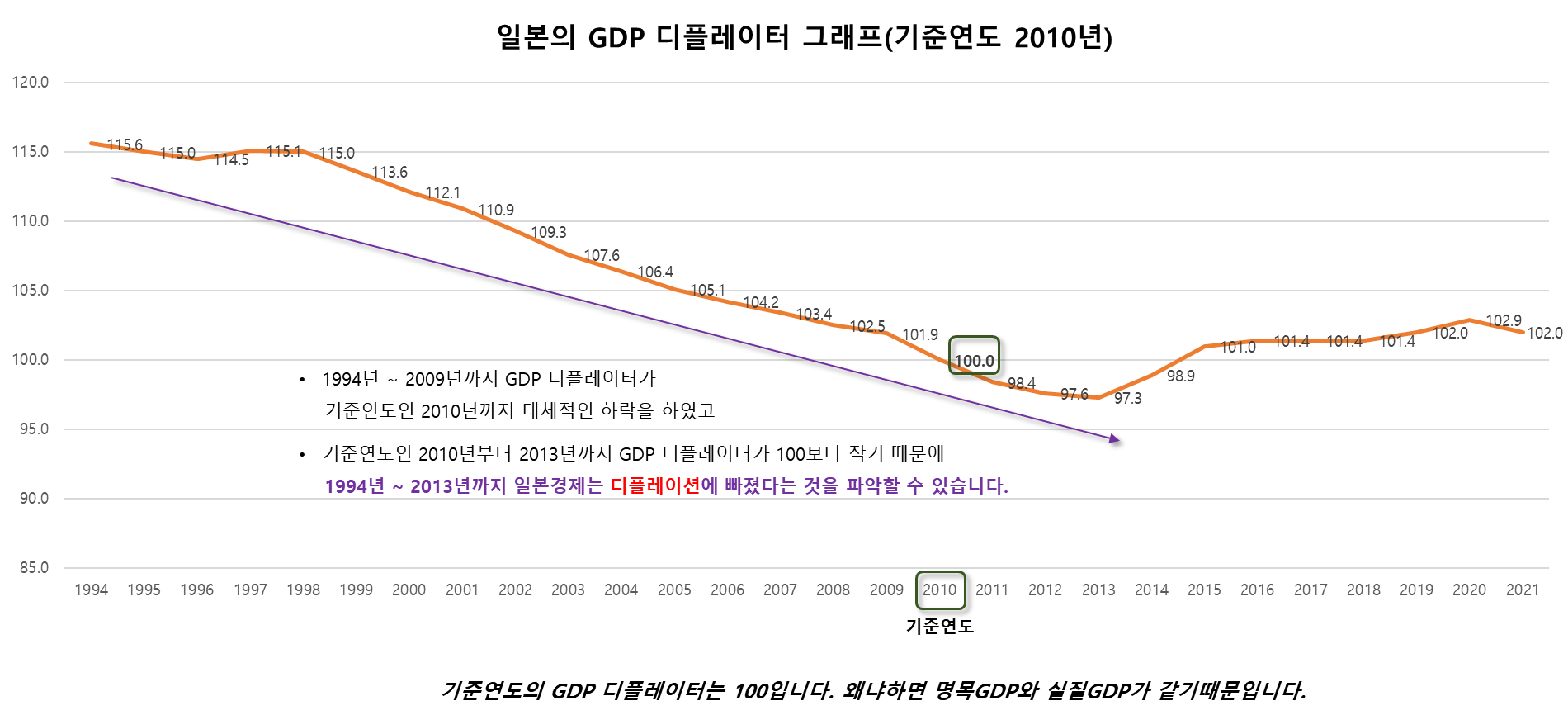 기준연도를 기준으로 이 2가지를 종합하면 일본의 경제는 1994년부터 2013년까지 경기침체 즉 디플레이션에 빠져있었다는 것을 알 수 있습니다.