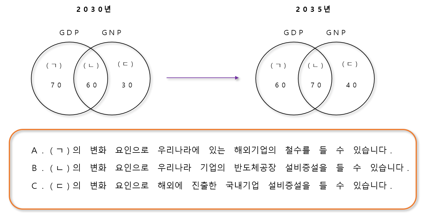 다음 그림은 2030년에서 2035년 GDP와 GNP의 변화를 나타낸 것입니다. 이와 관련된 설명으로 옳은 것을 모두 고르세요(숫자는 해당 영역의 크기입니다)