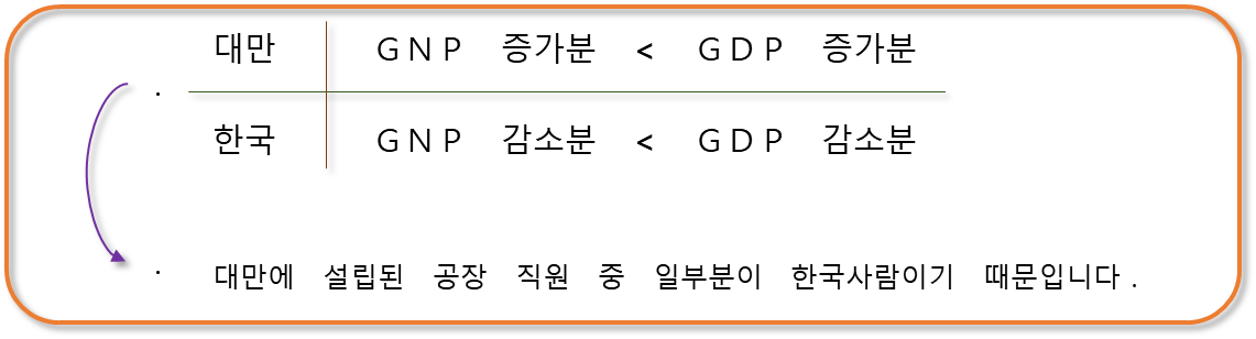 대만의 경우를 보면 GNP와 GDP가 모두 증가합니다. 하지만 국적에 기반한 GNP에서 일부분 다른 국적인 한국사람이 섞여있기 때문에 GDP만큼 증가하지 못하는 것입니다.